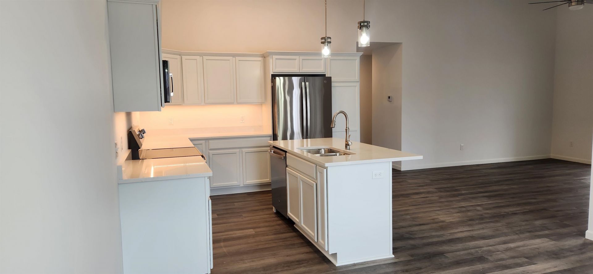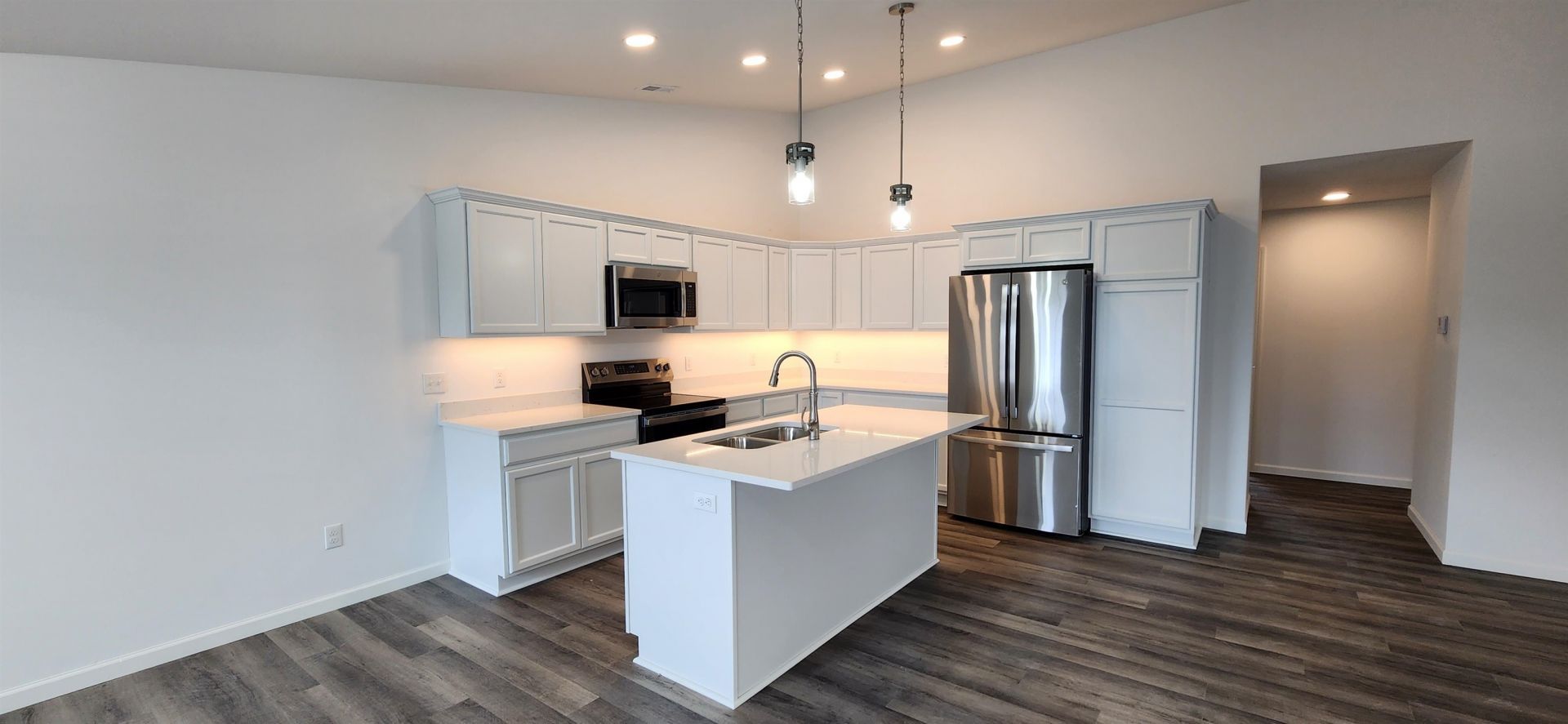 New Construction Available February 2026. One-level townhome with zero steps and a desirable location. The kitchen features an island with quartz countertops and SS appl. The open living room/dining room opens up to a patio. The oversized garage is insulated.